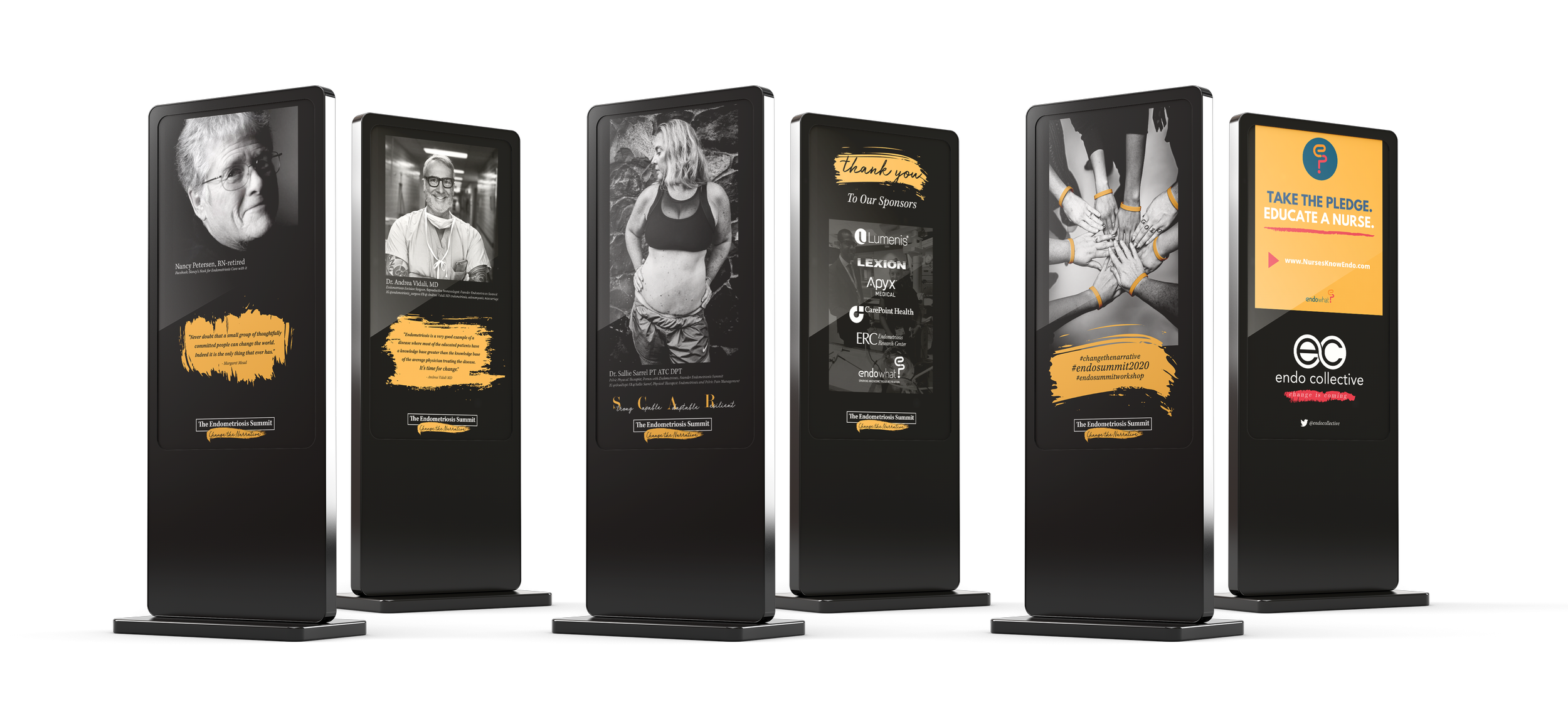 From 2019 to 2020, I created a range of digital signage for event presentations and on-screen displays. My work included designing holding slides and vertical branded elements that supported both in-person and virtual programming. Each piece was crafted to enhance clarity, reinforce the event’s identity, and create a cohesive visual experience across all digital touchpoints.